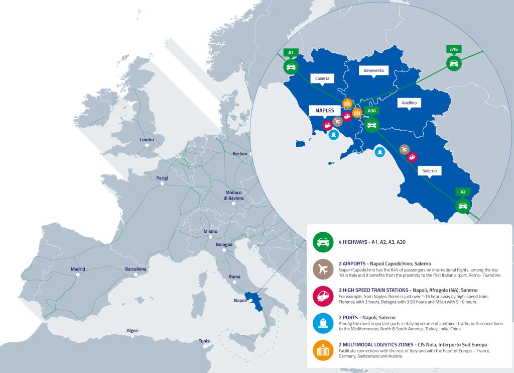 La Campania è una piattaforma industriale e logistica che permette di servire sia un importante mercato di prossimità, che l’Europa e mercati extra-europei chiave.